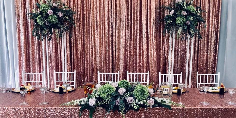 Złote,cekinowe nakrycia stołów prezentowały się obłędnie (miałam okazje widzieć na żywo) . Stół Pary Młodej zapierał dech ! Przepiękna dekoracja kwiatowa !
